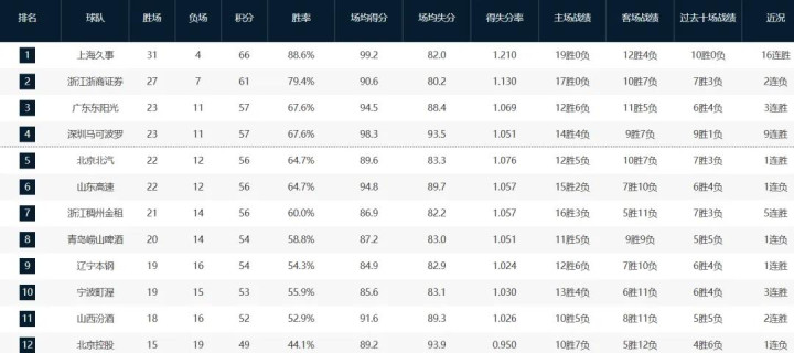 目前为止,广东队以23胜11负排名联盟第三,落后上海队(31-4)和广厦队(27-7)。