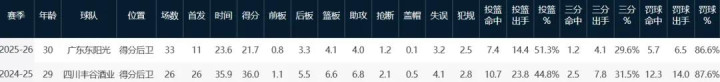 这哥们可是广东队的得分王,本赛季至今出战33场首发11次,场均上阵23.5分钟贡献21.7分4.1板4助1.2断,三项命中率51.3%、29.6%和86.6%。