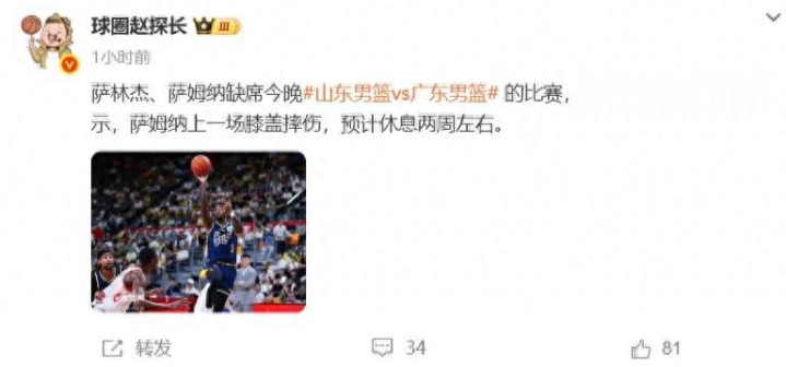 值得一提的是,大外援萨林杰同样在近日广东队100-80广厦队比赛中出现伤病情况,说是右腿拉伤归期待定,本赛季至今场均亮相22分钟得到12.8分8.4板3.6助1.1断,三项命中率52.6%、27.1%和70.1%。